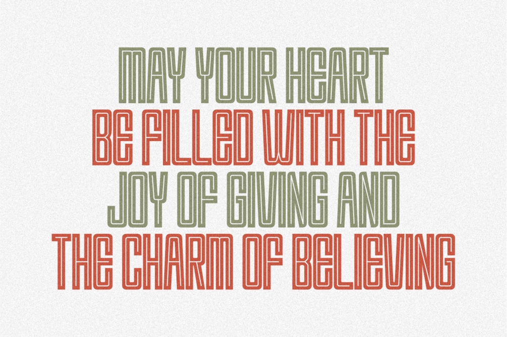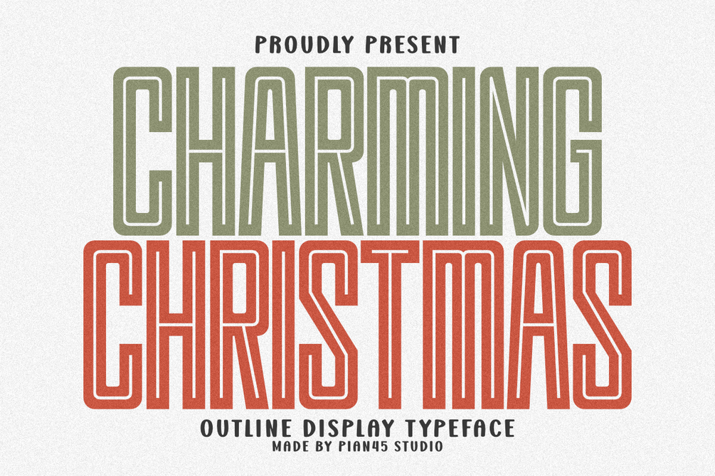 Charming Christmas is a striking Outline Display Typeface with an ultra-condensed structure, perfect for bold, layered designs and retro holiday aesthetics. Its strong, all-caps form and built-in outline style are ideal for Christmas apparel, winter event posters, seasonal branding, and impactful social media graphics. This unique typeface delivers a charming, nostalgic, and powerful visual identity, making it the perfect font for all your joyful December marketing and creative projects.
