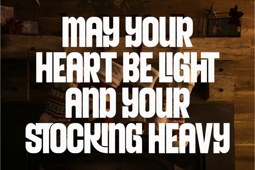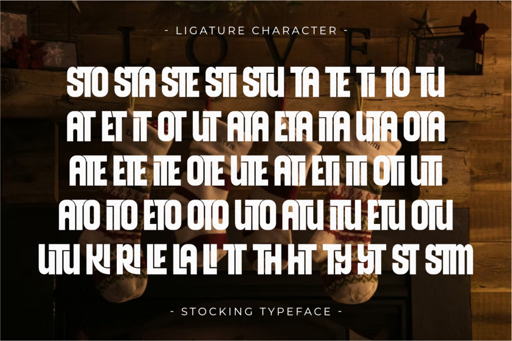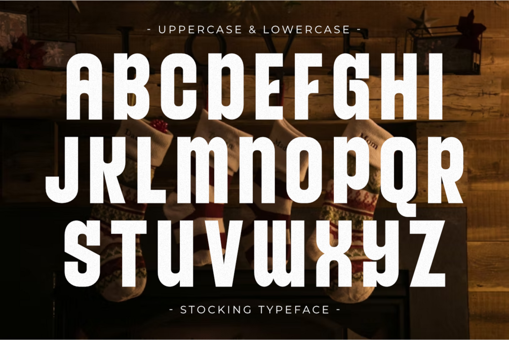 Stocking is a cheerful and bold Condensed Sans Serif font that captures the cozy spirit of the Christmas and Holiday season. Its thick, rounded structure and unique curved ascenders/descenders give it a playful yet modern festive appeal. With 52 elegant ligatures, this all-caps display font is perfect for high-impact seasonal apparel, holiday branding, greeting cards, Christmas posters, and any project needing a warm, unique, and joyful touch for winter design.